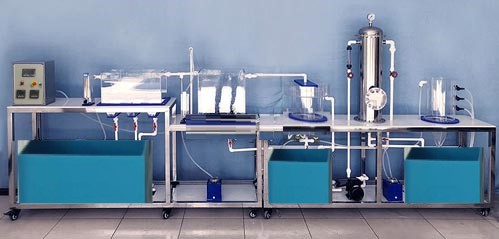 污水處理廠立體布置模型 / 廢水生物處理實(shí)驗(yàn)裝置,以小型污水處理廠部分處理系統(tǒng)為原型,配置多斗初沉池、曝氣池、二沉池、砂濾裝置及濃縮池等。污水通過配水箱被提升至初沉池進(jìn)行初級污泥沉淀,然后進(jìn)至曝氣池進(jìn)行接觸氧曝氣處理,曝氣通過小型空氣壓縮機(jī),并通過風(fēng)量計(jì)進(jìn)行對曝氣量的控制。經(jīng)過曝氣池的污水再通過二沉池進(jìn)行沉淀。再進(jìn)入砂濾裝置進(jìn)行過濾。最后進(jìn)入濃縮池進(jìn)行濃縮處理。學(xué)生通過對該污水處理廠立體布置模型系統(tǒng)的學(xué)習(xí),可了解系統(tǒng)中典型污水處理系統(tǒng)的應(yīng)用,掌握各個(gè)系統(tǒng)的工作原理,進(jìn)而具備設(shè)計(jì)污水處理廠各處理系統(tǒng)的能力。