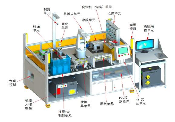 1 、本設(shè)備是工業(yè)機(jī)器人專業(yè)教學(xué)訓(xùn)練綜合實(shí)訓(xùn)設(shè)備采用模塊化配置思路,主要包括機(jī)器人單元、裝配單元、視覺單元、運(yùn)動(dòng)軌跡單元、碼垛單元、快換工具單元、打磨單元、焊接單元、去毛刺單元、倉庫單元、人機(jī)交互單元、 PLC 單元、離線編程單元、桌面平臺(tái)單元以及氣泵等。根據(jù)訓(xùn)練及考核任務(wù),可快速更換不同模塊,實(shí)現(xiàn)不同難度不同技能點(diǎn)的考核。系統(tǒng)深度集 成了離線編程技術(shù),軟件不僅包含硬件平臺(tái)的三維模型資源,還大大簡(jiǎn)化了涂膠、打磨、 焊接、碼垛等工藝實(shí)現(xiàn)的編程過程、提高軌跡復(fù)現(xiàn)精度、避免發(fā)生碰撞干涉。該工作站不僅滿足了職業(yè)院校不同專業(yè)學(xué)生針對(duì)工業(yè)機(jī)器人的操作和編程的教學(xué)需求,任務(wù)源于工業(yè)的特征也使其更加適于作為訓(xùn)考平臺(tái)。 平臺(tái)展示了工業(yè)自動(dòng)化智能制造、生產(chǎn)數(shù)字化、控制網(wǎng)絡(luò) 化、系統(tǒng)集成化等思想,涉及智能控制技術(shù)、工業(yè)機(jī)器人技術(shù)、機(jī)電一體化技術(shù)、計(jì)算 機(jī)應(yīng)用技術(shù)、軟件技術(shù)、相機(jī)測(cè)量技術(shù)等領(lǐng)域的知識(shí)和技能。