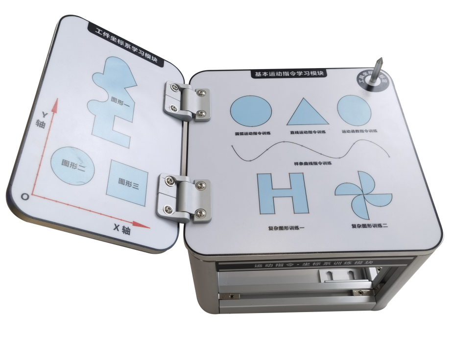 該模塊采用激光描繪圖案,完成圓弧、直線、 B 樣條曲線等基本運動指令的訓(xùn)練,同時可借助能任意調(diào)整角度的訓(xùn)練板進行工件坐標系標定訓(xùn)練,此外,模塊還設(shè)置了專用的工具標定尖供使用者完成工具坐標系的標定訓(xùn)練。