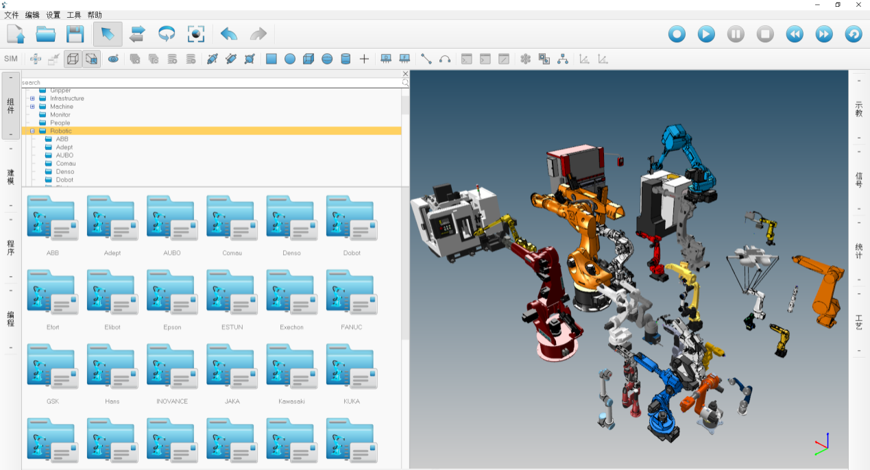 ( 1 )仿真系統(tǒng)支持 50 種以上的各品 牌機(jī)器人模型和大量生產(chǎn)線組件庫;