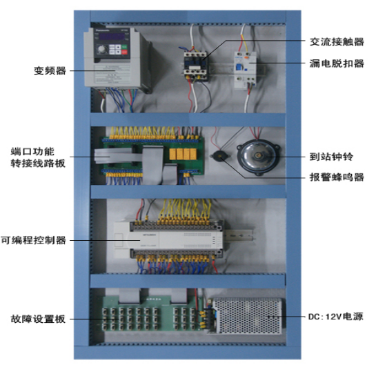 3. 電氣控制部分 :電源空氣開關(漏電脫扣器)、 DC 24 V驅動電源 、 DC12V驅動電源、PLC可編程控制器、接線端口電路板、到站鐘等。