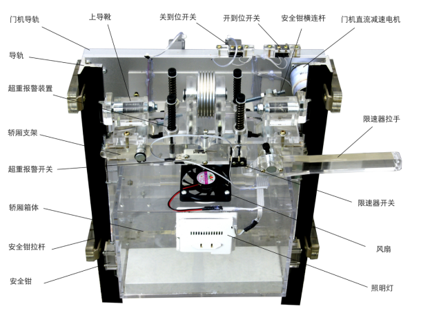 我公司的 DT系列透明電梯是根據最常見的升降式電梯結構, 采用鋼管焊接一體而成,表面經過磷化噴塑處理、具有良好的結構剛性。為了便于教學,電梯主要機構部件均采用透明有機材料制成 (包括:限速器、轎廂、層門及門廳立面、轎門、轎廂、機房底板、導軌支架 …… )為了使電梯運行控制更加精密可靠逼真,設計了與實際電梯比例縮小的鋁合金轎廂對重導軌、及轎門門機導軌、層門導軌。