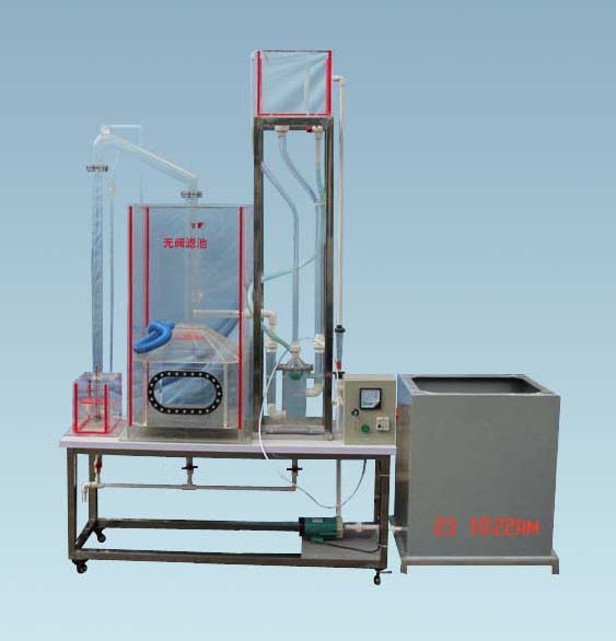 1 、 無閥濾池 1 套:透明有機玻璃材質(zhì)、厚度 10mm ,含池體、進水槽、進水管、虹吸上升管、頂蓋、檔板、濾料層、承托層、配水系統(tǒng)、連通渠、沖洗水箱、出水管、虹吸輔助管、抽氣管、虹吸下降管、水封井、虹吸破壞斗、虹吸破壞管、有機玻璃池 1 只、反沖洗虹吸管 1 套、強制虹吸器 1 套、強制沖洗器 1 套、反沖洗出水井 1 只、反沖洗三角調(diào)節(jié)器 1 只、進水氣水分流器 1 只、進水高位水箱及自動反沖洗裝置 1 套、進水回氣管 1 根、過濾出水管 1 根;