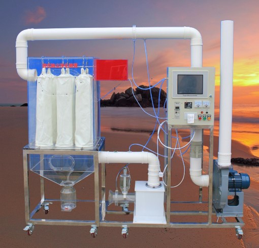 其主要原理是:含塵氣流從進氣管進入除塵設(shè)備后,從圓筒形濾袋外側(cè)向布袋內(nèi)側(cè)流動,在通過濾料的孔隙時,粉塵被捕集與濾料上,透過濾料的清潔氣體由濾袋上部開口排出。沉積在濾料上的粉塵,可定期由在安裝在布袋開口上方的壓縮空氣噴嘴釋放高壓氣體而造成布袋膨脹、振動而從濾料表面脫落,落入灰斗中。因為濾料本身網(wǎng)孔較大,因而新鮮濾料的除塵效率較低,粉塵因截流、慣性碰撞、靜電和擴散等作用,逐漸在濾袋表面形成粉塵層,常稱為粉層初層。初層形成后,它成為袋式除塵器的主要過濾層,提高了除塵效率。濾布只不過起著形成粉層初層和支撐它的骨架作用,但隨著粉塵在濾袋上積聚,濾袋兩側(cè)的壓力差增大,會把有些已附在濾料上的細(xì)小粉塵擠壓過去,使除塵效率顯著下降。另外,若除塵器阻力過高,還會使除塵系統(tǒng)的處理氣量顯著下降,影響生產(chǎn)系統(tǒng)的排風(fēng)效果。因此,除塵器阻力達到一定數(shù)值后,要及時清灰。本設(shè)備可作為布袋除塵凈化實驗原理演示裝置