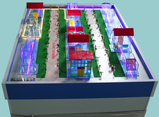 本裝置是典型污水處理廠的平面布置模型。通過(guò)對(duì)模型的觀察使學(xué)生能直觀的了解其典型污水處理工藝流程,對(duì)以后的教學(xué)設(shè)計(jì)提供幫助。