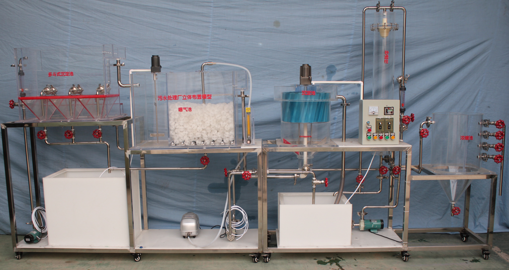 本裝置配備了完整的污水處理系統(tǒng),包括配水系統(tǒng)、多斗式初沉池、曝氣池、沉淀池、污泥回流系統(tǒng)、壓力砂濾罐、角錐濃縮池等。同時,還提供了攪拌配水箱、水泵、調(diào)速電動機(jī)及調(diào)速器、污泥回流水泵、旋渦式氣泵、轉(zhuǎn)子流量計、氣體流量計、微孔曝氣器、電控箱、漏電保護(hù)開關(guān)、按鈕開關(guān)、連接管道、球閥以及不銹鋼臺等配套設(shè)備,確保實(shí)訓(xùn)的順利進(jìn)行