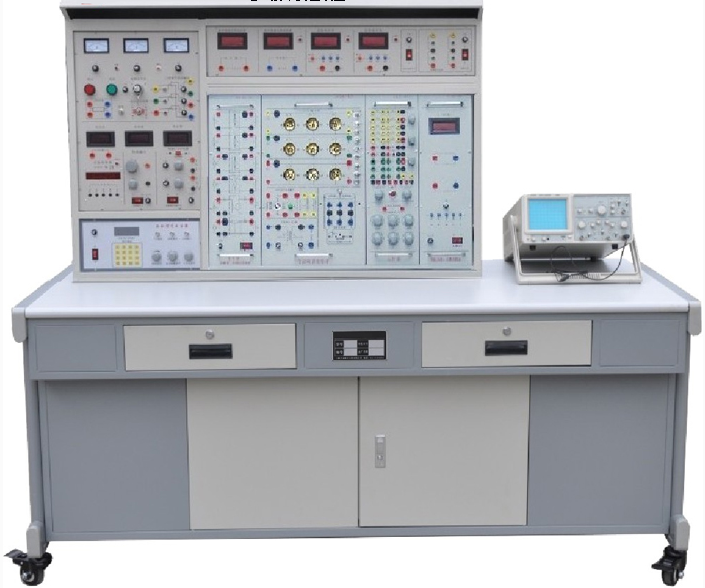 實驗桌為鐵質雙層亞光密紋噴塑結構,桌面為防火、防水、耐磨高密度板;左右設有兩個大抽屜(帶鎖),用于放置工具及資料。右邊設有放置示波器用的可拆卸擱板。
