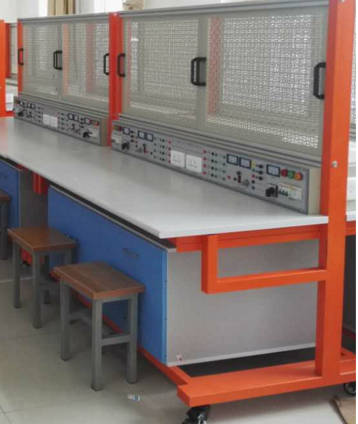 2 、實(shí)訓(xùn)桌桌面采用 25mm 麻灰色高密度層壓板封邊特制,有效提高絕緣等級;實(shí)驗(yàn)桌底部裝有至少 4 個導(dǎo)向輪,方便實(shí)訓(xùn)臺架移動;