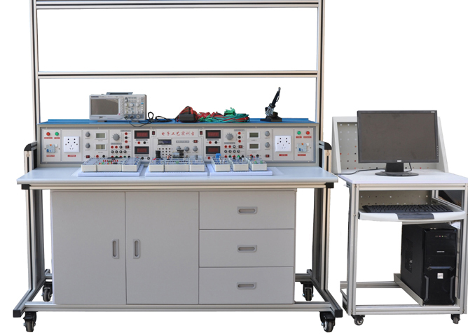 采用工業(yè)鋁合金型材框架,在電源控制屏上方為兩層結(jié)構(gòu)。其中第一層既可放置外配儀器儀表,也可掛放其它通用電工電子實(shí)訓(xùn)掛箱,擴(kuò)展完成多門課程實(shí)訓(xùn);第二層可放置 PVC 夾板,用來夾放實(shí)訓(xùn)圖紙。實(shí)訓(xùn)臺(tái)下方還設(shè)有四個(gè)帶剎車的萬向輪,便于移動(dòng)和固定。
