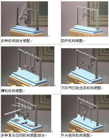 3、實驗方案齊全:實驗臺由三維機架、多向滑塊、電機、低副桿組、高副桿組、齒輪、凸輪、棘輪、槽輪、蝸輪蝸桿、萬向聯(lián)軸節(jié)、鏈傳動、帶傳動組成,可拼裝包括平面及空間機構(gòu)在內(nèi)的多達 40 種以上的組合實驗方案。