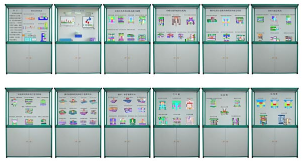 陳列柜共分十二個(gè)柜和一個(gè)電腦控制臺(tái),進(jìn)行多媒體聲控同步解說演示。由 PC 電腦軟件控制順序或任選播放圖像或三維動(dòng)畫同步模型演示模具功能原理。